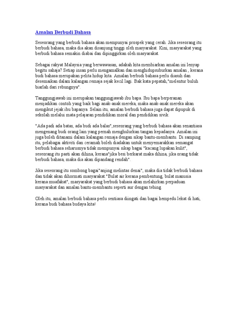 Amalan berbudi bahasa dalam kalangan remaja ini boleh dikatakan sebagai sikap bersopan ketika remaja itu berinteraksi dengan individu lain. Namun sayangnya pada masa kini budi bahasa tidak lagi dilihat sebagai elemen penting yang menyempurnakan. 74 contoh latihan karangan upsr 1.